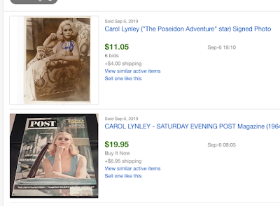 Dozens and dozens of items, languishing in autograph dealer stores, have remained unsold and are not likely to ever sell unless the prices are drastically lowered. Even then, they'll only sell to collectors who have to collect everything. There were a lot of blonde actresses back then, as there are now. Diane McBain tries to get $25 mail order to sign a picture (she's now living in the Motion Picture home, which might suggest that autograph profits are slight). She noted to her handful of Facebook followers that she was sometimes mistaken for Carol Lynley, and that she sympathized when Carol's career began to decline.
